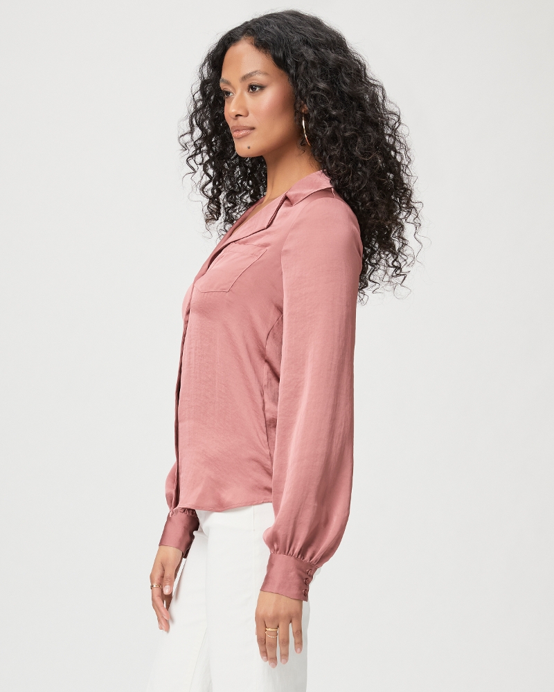 SKU: 8680K08-B347 Crafted from luxuriously soft satin, the Capriana Shirt is a classic long sleeve button down with a collar and lapel, patch pocket, and has a flattering, smooth drape with a relaxed fit. This elevated shirt in a dusky mauve pink hue can be dressed up or down and taken from day to night.