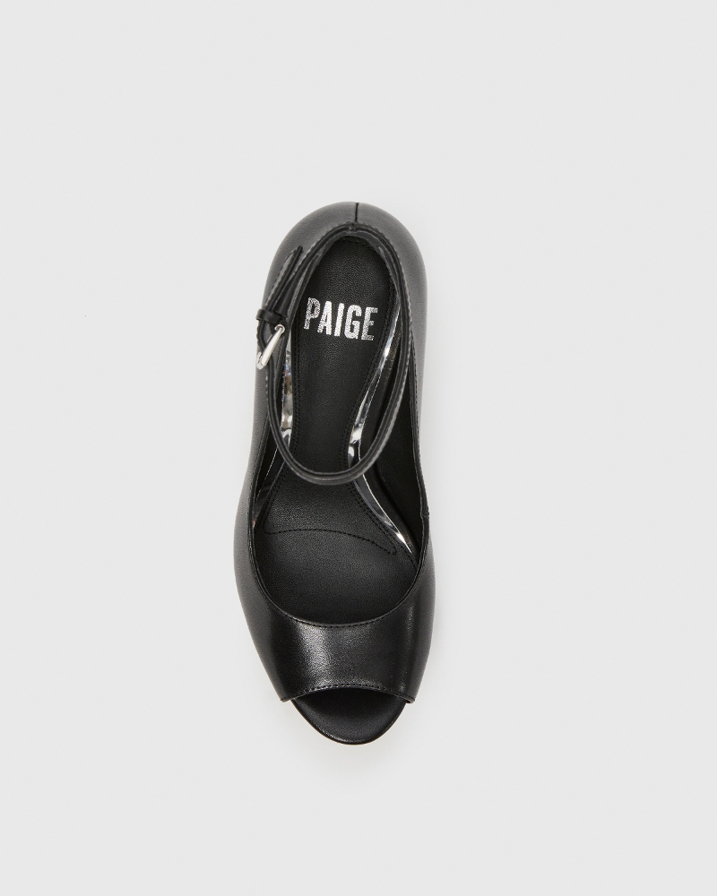 SKU: SH546101-BLK Cassidy is one of our founder��s favorites of the season. This new platform peep-toe pump is crafted from incredibly soft black leather and features a flattering scooped topline, a curved pattern at the back counter, an ankle strap with a silver half square metal buckle closure, a black stacked, slightly tapered block heel, and a stacked platform. This sophisticated style is perfect for transitional weather and pairs well with tights, wide leg jeans, and dresses.