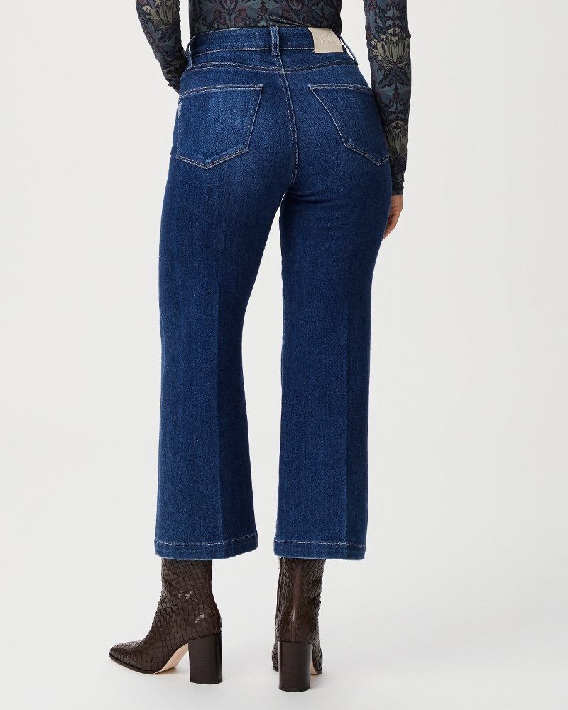This ultra high-waisted cropped wide leg is based off of our adored Anessa silhouette, but updated with a waist-to-hip ratio designed for an hourglass shape. Spotlight is designed with a comfortable top block that accounts for curves as it goes from slim waist to fuller hips and thighs; with specialty back pockets that embrace a wider back that typically distorts pockets; and with a complementing back yoke that flatters and highlights the booty. This style is cut from PAIGE Vintage denim in a clean, bright dark wash with patch pockets. PAIGE Vintage takes all of the work out of breaking in your favorite pair of vintage jeans. We've combined the comfort of stretch with everything you love about authentic vintage denim to create super soft jeans that feel perfectly lived-in from the very first wear.