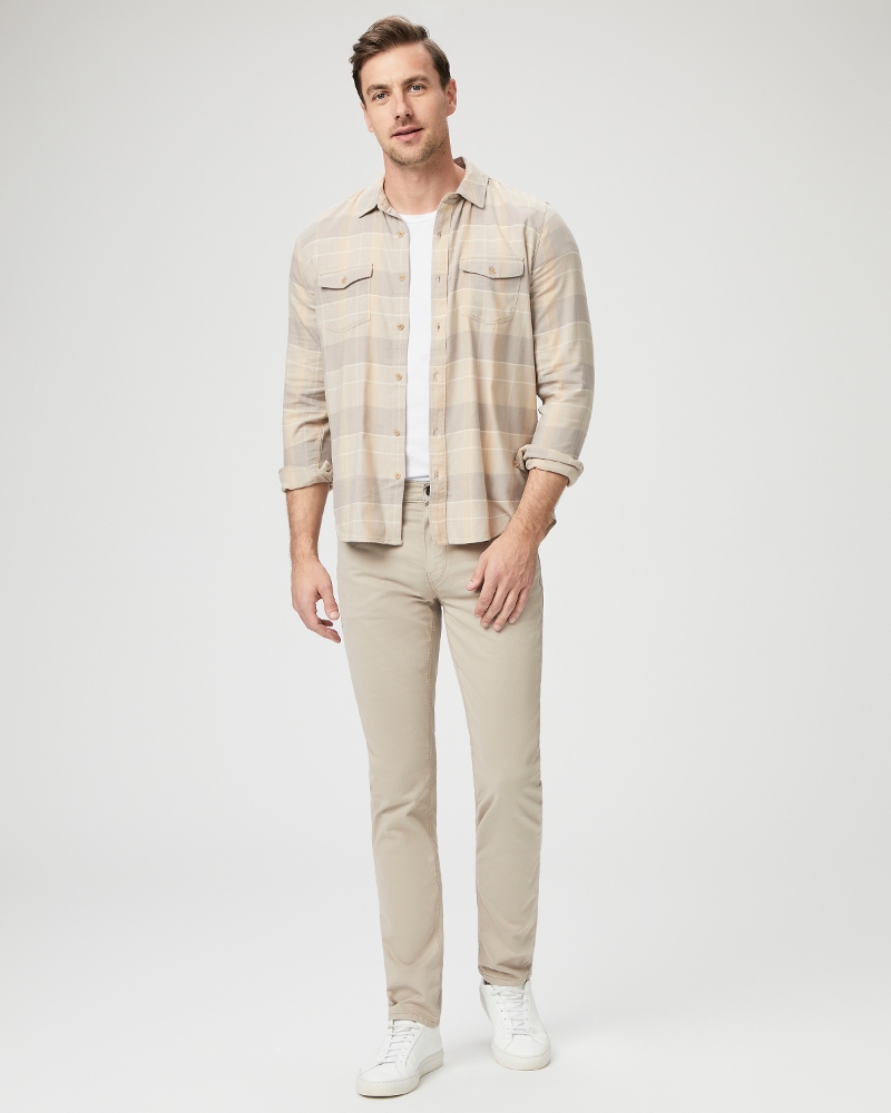 SKU: M653F91-7882 Take a break from your everyday denim and opt for this khaki twill pair that can easily be dressed up or down. This slim pant is expertly crafted from Eco Twill, a more sustainable take on traditional twill that contains a portion of recycled cotton which helps reduce the amount of textile waste in the industry. This mid-weight, matte sateen fabric has a brushed surface for the softest handfeel and contains slight stretch for all-day comfort and ease of movement.
