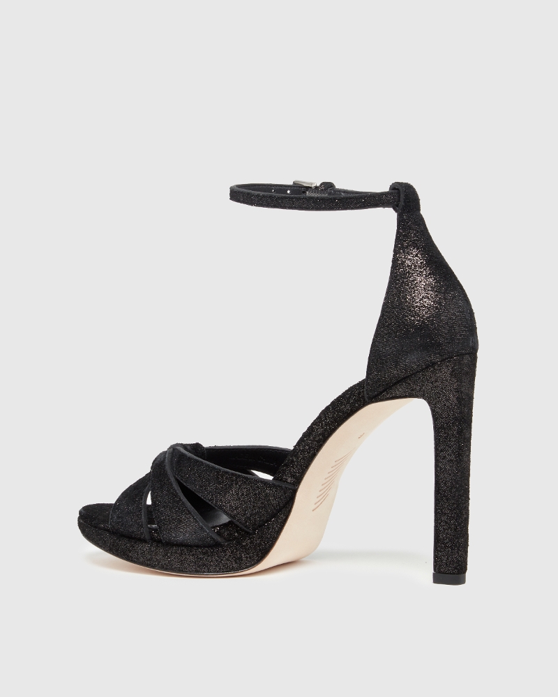 SKU: SH562402-BLK Val is one of our favorites of the season. Set on a strong, set-back stiletto heel, this slim, feminine platform sandal is crafted from luxuriously soft black shimmer suede that adds a touch of sparkle and shine. This beauty features a unique interlocked vamp pattern, a rounded back counter with an ankle strap, and a silver metal half buckle closure. Our signature cushioned insole guarantees a comfortable fit from morning to moonlight.